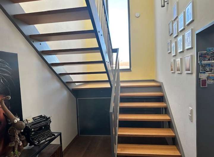 Über die elegante Podest-Treppe mit dem großzügigen Lichtband gelangen sie ins Dachgeschoss zu den drei Schlafzimmern. Auch im Dachgeschoss überzeugt das große waagerechte Lichtband.