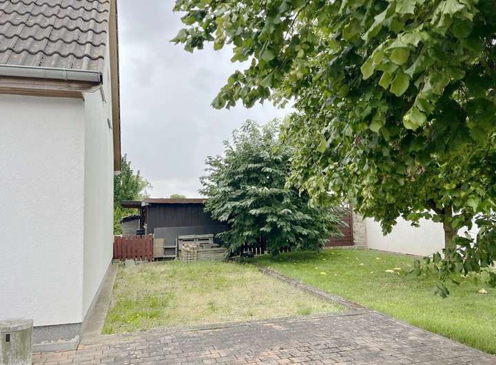 Der Garten ist pflegeleicht angelegt und verfügt über einen praktischen Geräteschuppen.