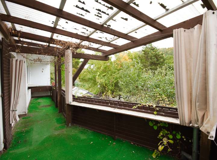 Für den Anbau und die Balkonanlage liegen weder bei den Eigentümern noch beim Bauamt Genehmigungsunterlagen vor; ob die Bauteile damals genehmigt wurden, ist unklar. Die betreffenden Flächen sind zwar in der amtlichen Liegenschaftskarte eingezeichnet, dies ist jedoch lediglich ein Indiz und kein Nachweis für eine etwaige Baugenehmigung. Betroffen sind Diele, Küche und Vorratsraum im Erdgeschoss sowie der wohnraumähnliche Hobbyraum im Untergeschoss. Aus Haftungsgründen wird im Kaufvertrag davon ausgegangen, dass diese Bereiche nicht genehmigt sind; die offiziell anrechenbare Wohnfläche beträgt daher rund 86,74 m².