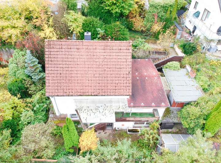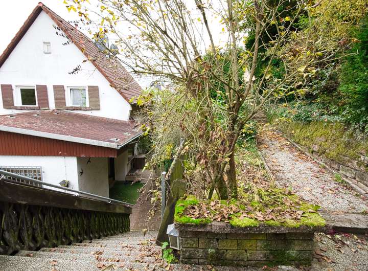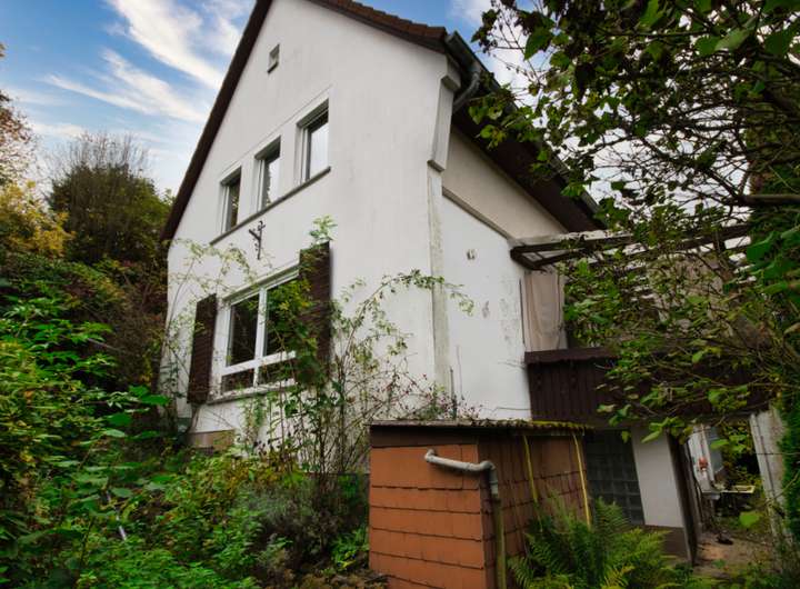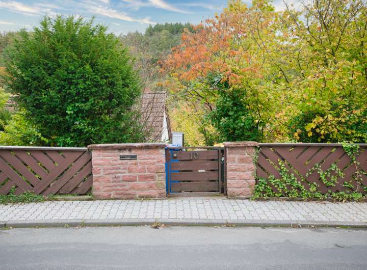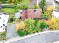 Das große, naturbelassene Grundstück mit Obstbäumen bietet viel Potenzial, ist derzeit aber verwildert und lädt dazu ein, eigene Gestaltungsideen Schritt für Schritt umzusetzen.