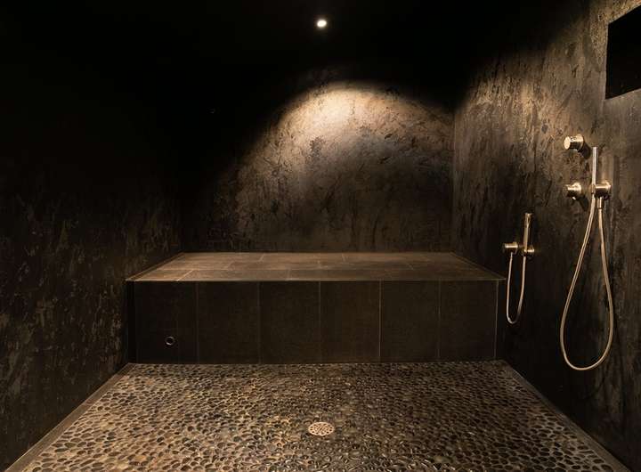 * Vollbad mit Dampfsauna und indischen Flusskiesel als Bodenbelag