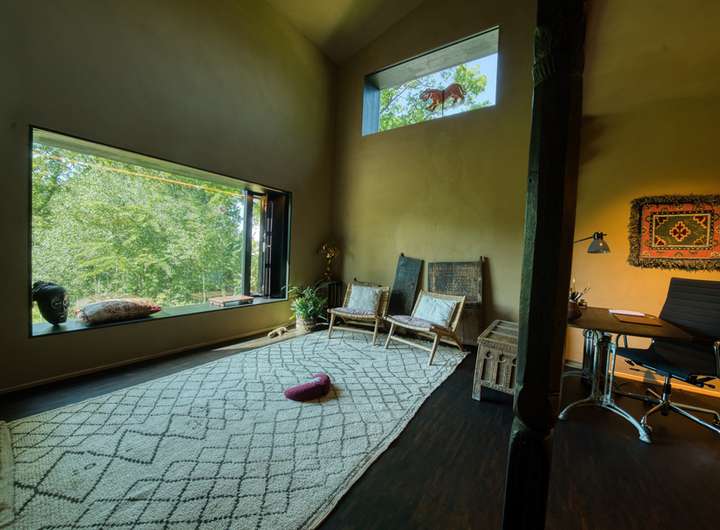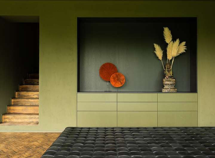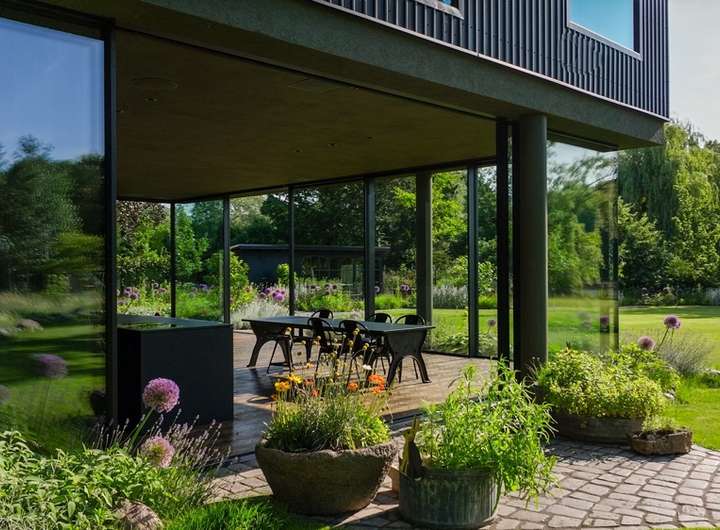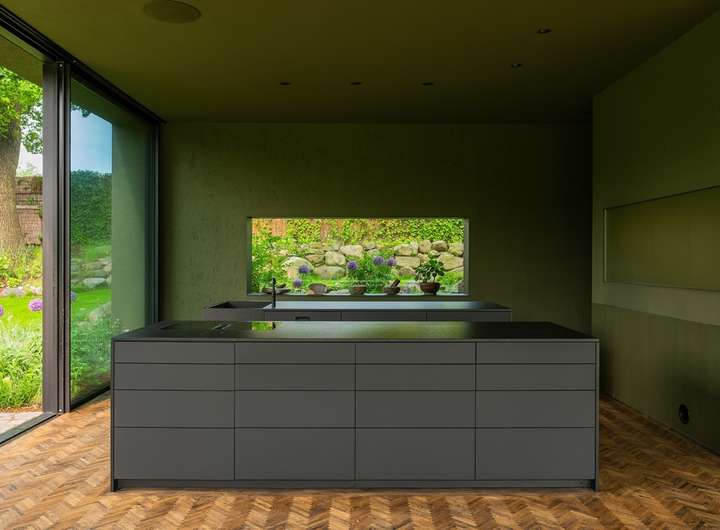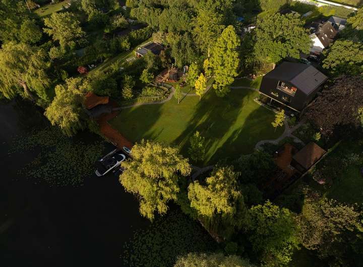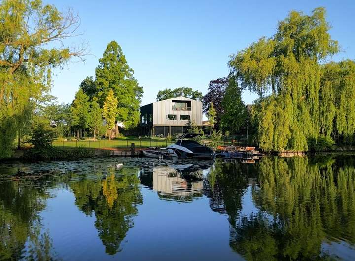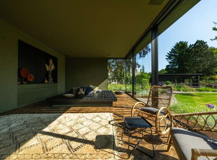 Von innen eröffnet sich der Blick in den Park und auf die Elbe, während das Gebäude von außen harmonisch mit seiner Umgebung verschmilzt. Im Erdgeschoss, wo der Rasen beinahe bis an das Eichenparkett reicht, lösen sich die Grenzen zwischen Innen und Außen auf. In den Schlafzimmern wird man von der Morgensonne geweckt, die über dem Wasser aufgeht. Von der Loggia aus schweift der Blick den Flussarm hinunter, begleitet vom Zwitschern der Vögel – man vergisst, dass man sich mitten in Hamburg befindet.