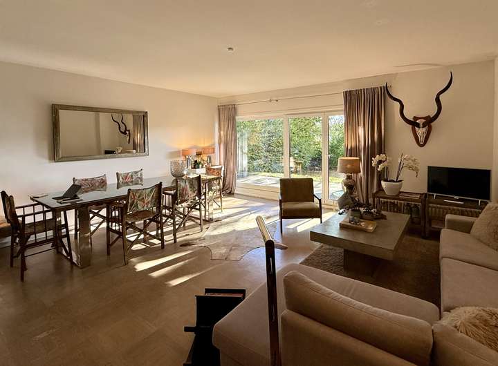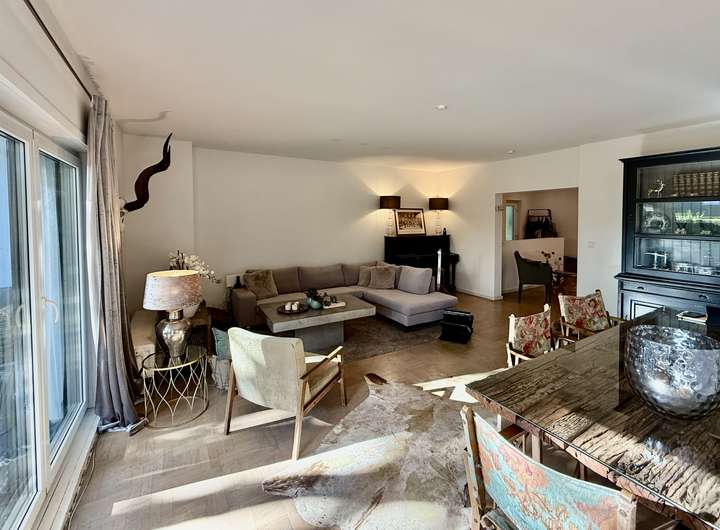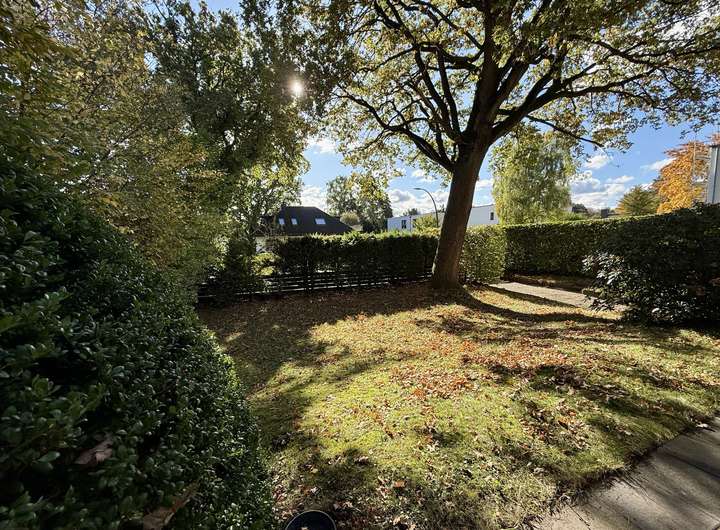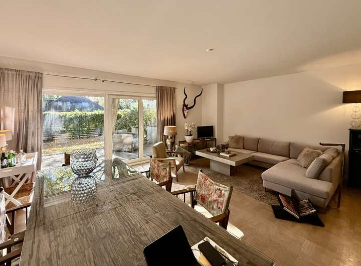 Der lichtdurchflutete Wohnbereich überzeugt mit großen Fensterfronten, die einen herrlichen Blick in den Garten gewähren, sowie mit direktem Zugang zur sonnigen, nach Süden ausgerichteten Terrasse – ein perfekter Ort zum Entspannen und Genießen.