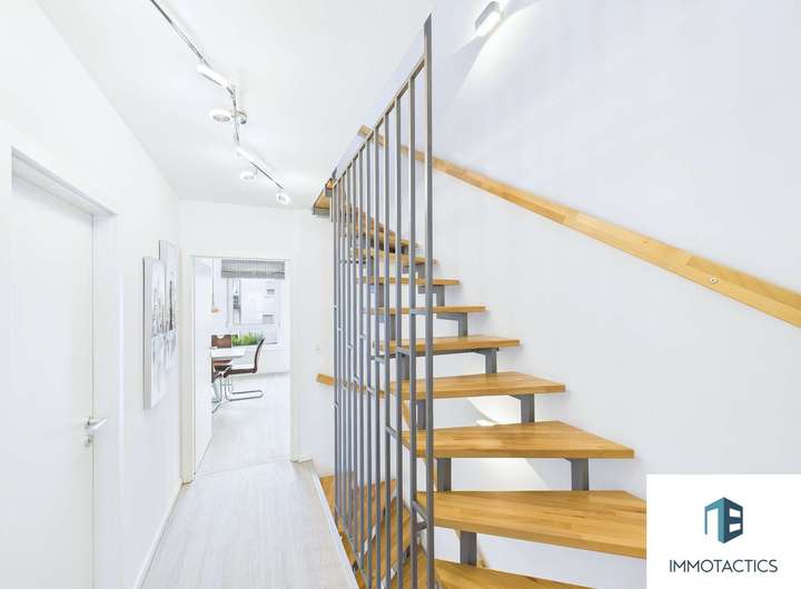 Im Erdgeschoss erwartet Sie ein einladender Wohn- und Essbereich, der durch bodentiefe Fenster lichtdurchflutet ist und einen direkten Zugang zur großzügigen Terrasse und dem privaten Garten bietet – ideal für entspannte Stunden im Grünen oder gesellige Abende mit Freunden. Die separate Küche bietet ausreichend Platz für Kochvergnügen und Familienleben und lässt sich bei Wunsch auch offen gestalten. Der separate Abstellraum kann dabei als Vorratskammer oder als Haushaltsfläche genutzt werden. Die offene Treppe im Erdgeschoss führt in das Obergeschoss, wo sich die Schlafräume und das Badezimmer befinden.