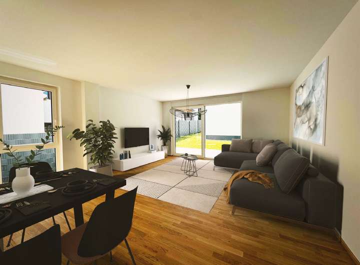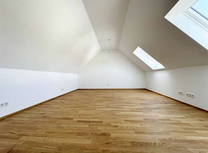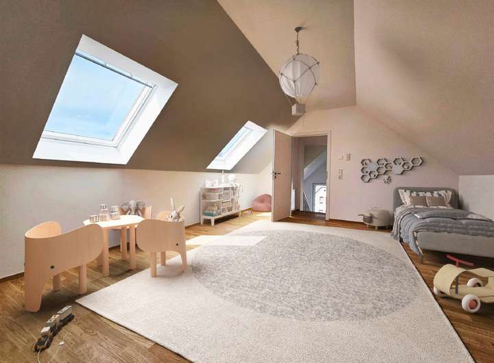 4 große Zimmer, Wohnküche, 2 moderne Badezimmer, Gäste-WC, Büro-Bereich, sonnige Terrasse und