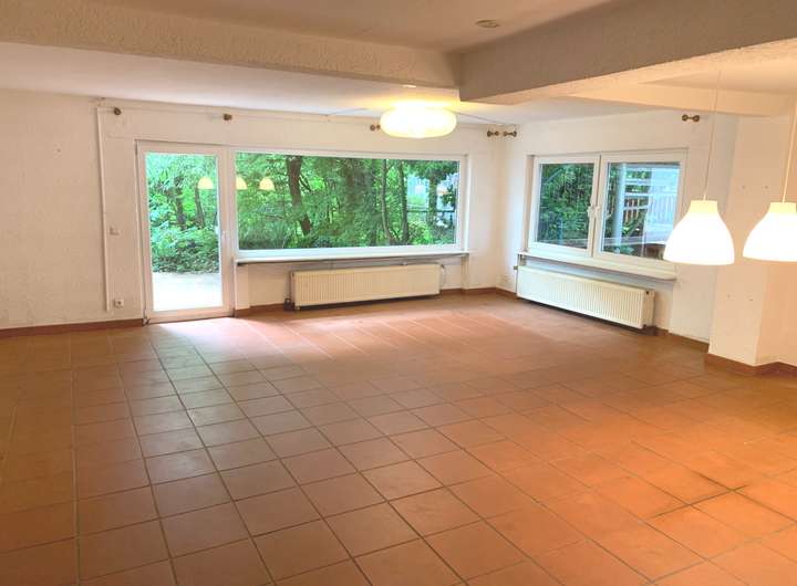 Im Erdgeschoss gelangen Sie über die Diele und das Treppenhaus, das das gesamte Gebäude zentral erschließt unter anderem zu dem außergewöhnlich großen Wohn- / Essbereich, der viel Platz und somit Gestaltungsmöglichkeiten bietet. Ergänzt wird dieser Bereich durch eine große Terrasse mit Blick ins Grüne. Neben dem Wohnbereich befindet sich auch die Küche mit anschließender Speisekammer sowie ein Duschbad und ein kleines Gäste-WC im Eingangsbereich des Hauses. Auch ein großes Schlafzimmer befindet sich auf dieser Ebene.