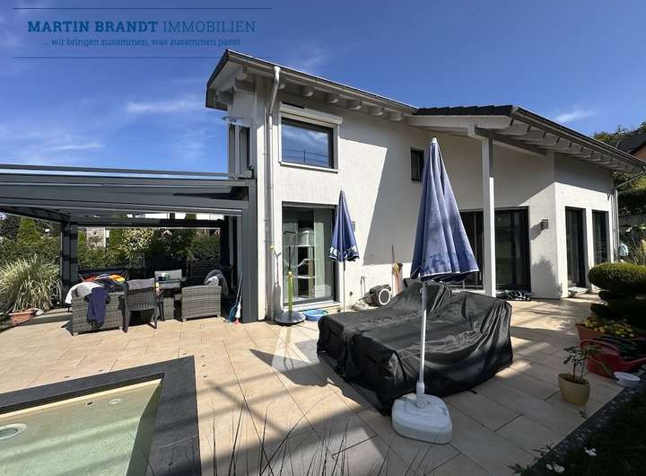 Die stilvolle und offene Einbauküche mit Fernseher lässt keine Wünsche offen und bietet den idealen Raum für kulinarische Kreationen. An die Küche grenzt eine separate Speisekammer. An heißen Sommertagen sorgt die Wohlfühl-Klima-Heizung (Proxon-Lüftungssystem) für angenehme Temperaturen im gesamten Haus. Der herrliche Außenbereich mit unverbaubarem Weitblick und sonniger Südwest-Terrasse (64 m²) lädt zum Entspannen und Verweilen ein. Der wunderschön parkähnliche Garten bietet eine Oase der Ruhe mit Wellness-Charakter. Der große Garten ist vollständig mit blühenden Pflanzen bepflanzt. Der traumhafte Pool mit Wasserfall ist der perfekte Ort für erholsame Stunden im Freien.