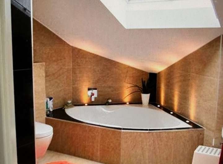 - Bad mit Fenster, große Eckwanne, LED-Wassereinbaustrahler mit Farbwechsler (Wasserbeleuchtung) und mit großer stufenlos begehbarer Dusche, Fußbodenheizung