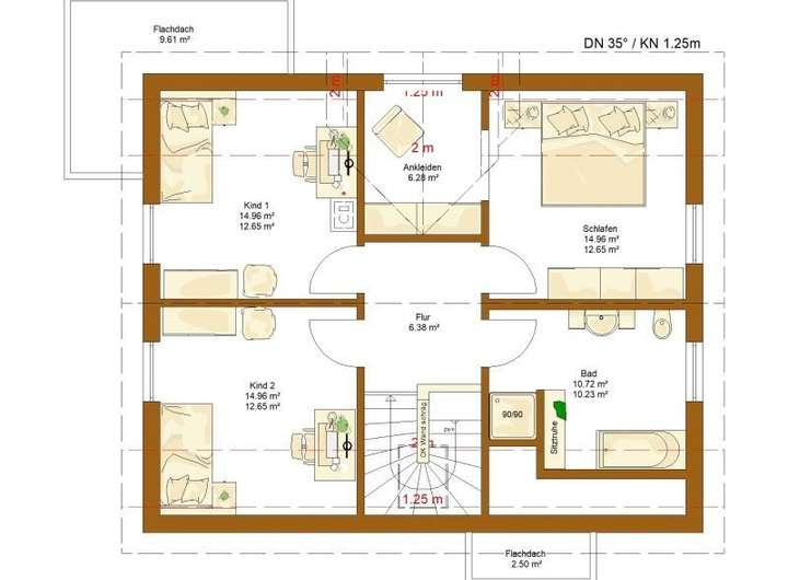 Ein traditionelles Satteldach in Verbindung mit einem dritten Giebel ist das prägende Gestaltungselement dieses Hauses. Unter dem Dach findet sich Platz für zwei Kinderzimmer, ein Elternschlafzimmer mit lichtdurchfluteter Ankleide sowie ein modernes Familienbad. Das Erdgeschoss bietet viel Raum für das tägliche Familienleben und außerdem noch ein zusätzliches Zimmer, welches als Büro, Gästezimmer oder weiteres Kinderzimmer genutzt werden kann.