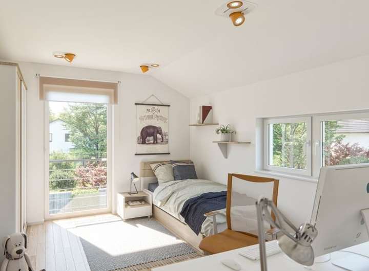 Im Obergeschoss erwarten Sie zwei gleich große Kinderzimmer, ein Elternschlafzimmer mit angrenzender Ankleide sowie ein stilvoll gestaltetes Bad. Die kompakte und clevere Bauweise macht das Haus besonders geeignet für schmale Grundstücke.
