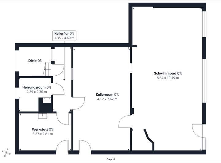 Vom Wohn-/Essbereich führt zudem eine Treppe in ein zwischen Haus und Garage gelegenes Nebenzimmer mit praktischem, ebenerdigem Gartenzugang. Von dort gelangt man in das Kellergeschoss. Hier zeigt sich ein großzügiger, variabel nutzbarer Bereich mit Werkstatt- und Technikräumen. Ein Teil des Kellers wurde 2024 modernisiert und zuvor als Sauna- und Fitnessraum genutzt. Die Ausstattung wurde vom Eigentümer mitgenommen, sodass der Raum heute offen, gepflegt und bereit für eine neue Nutzung ist – ideal für ein Home-Spa, Fitnessraum, Studio oder andere individuelle Wohnideen. Der teilweise rückgebaute ehemalige Poolbereich bietet zusätzlich großes Potenzial für eine kreative Umgestaltung.
