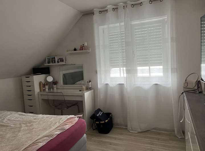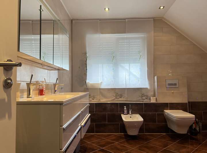 Obergeschoss: 3 helle Zimmer und ein großzügiges Tageslichtbadezimmer.
