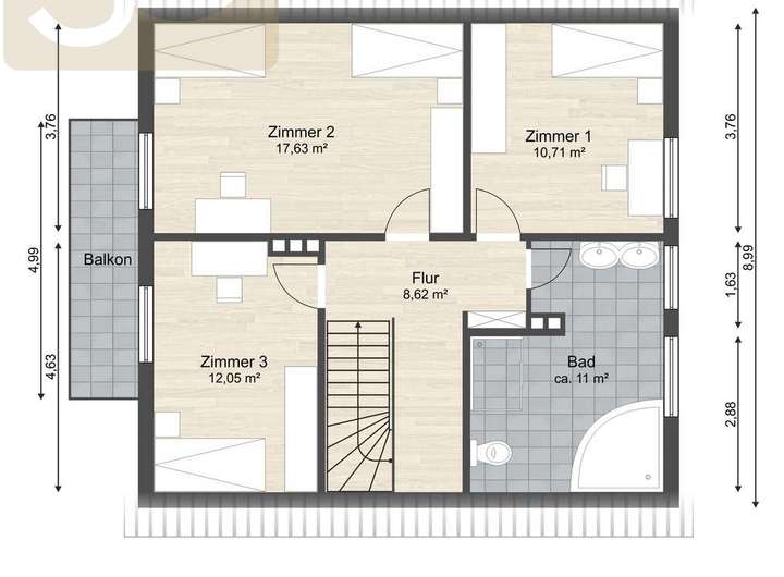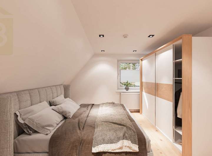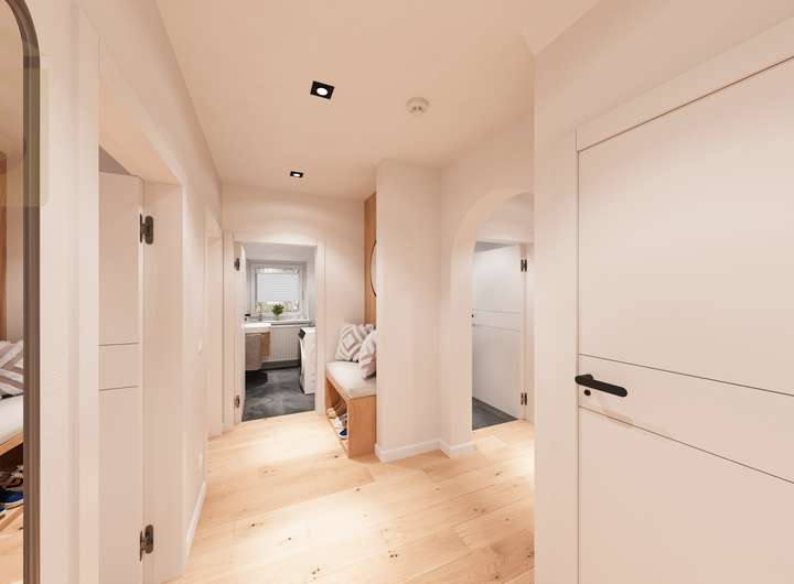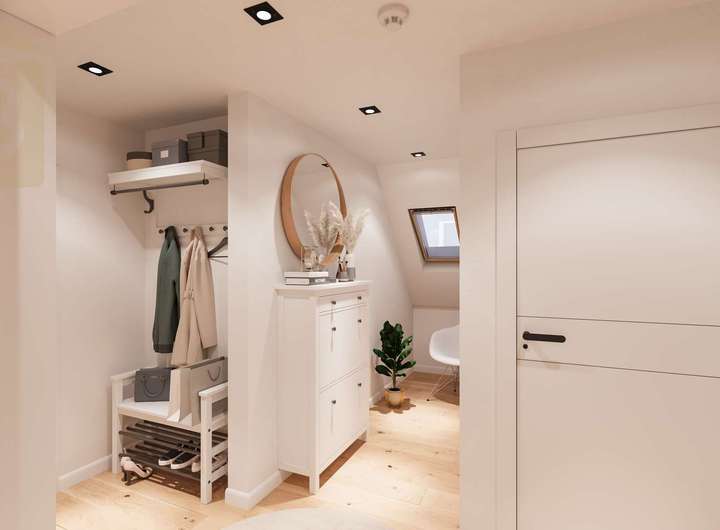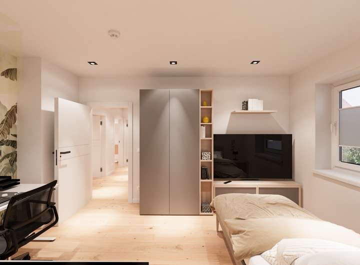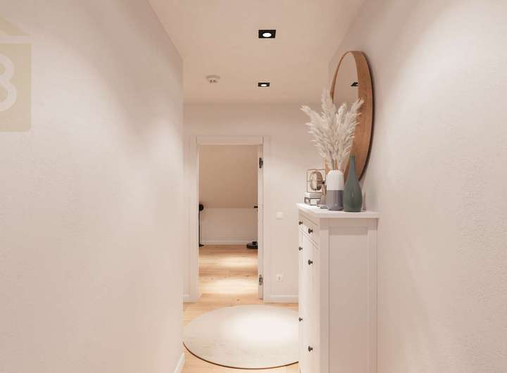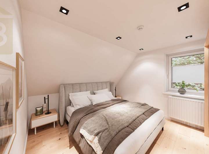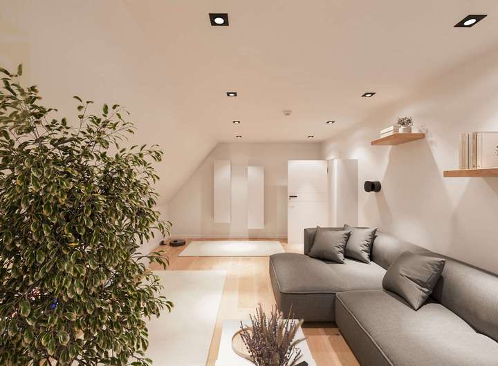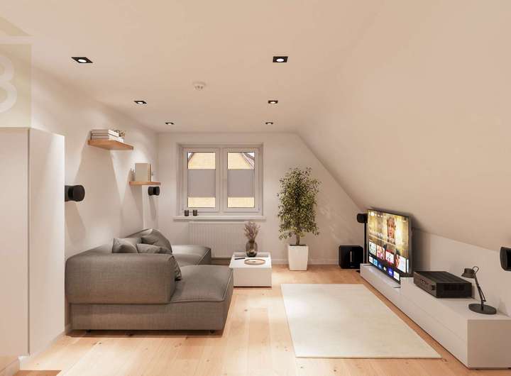 Das Dachgeschoss erweitert das Platzangebot um drei weitere Zimmer, die flexibel als Schlaf-, Hobby- oder Arbeitsräume genutzt werden können. Zusätzlich steht hier ein großes Badezimmer zur Verfügung, sodass auch im oberen Bereich hoher Wohnkomfort gewährleistet werden kann.