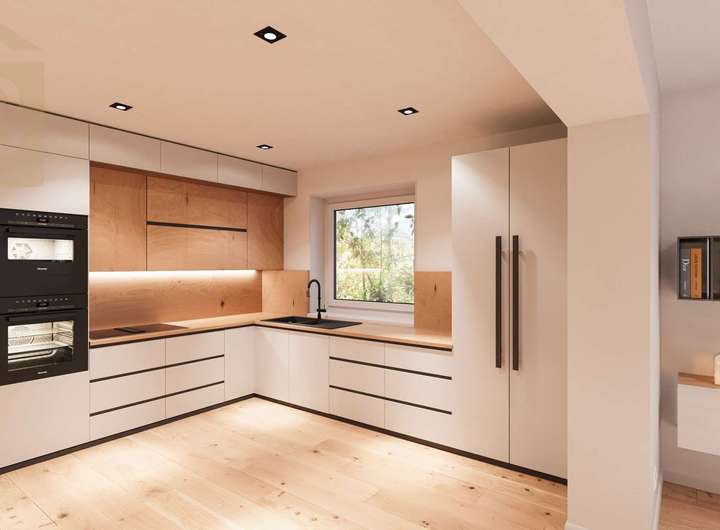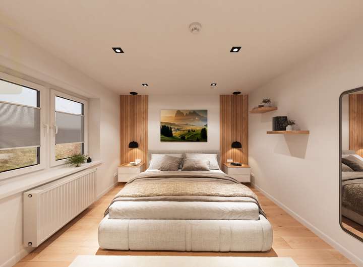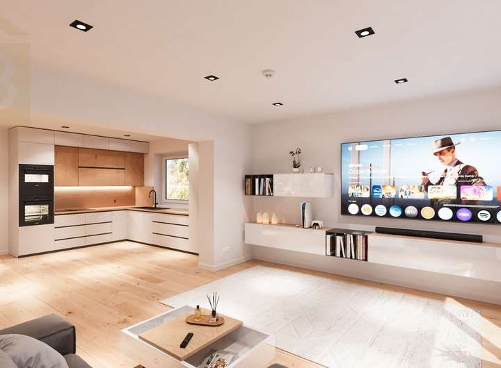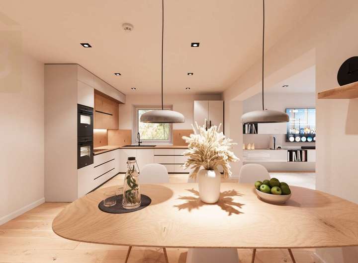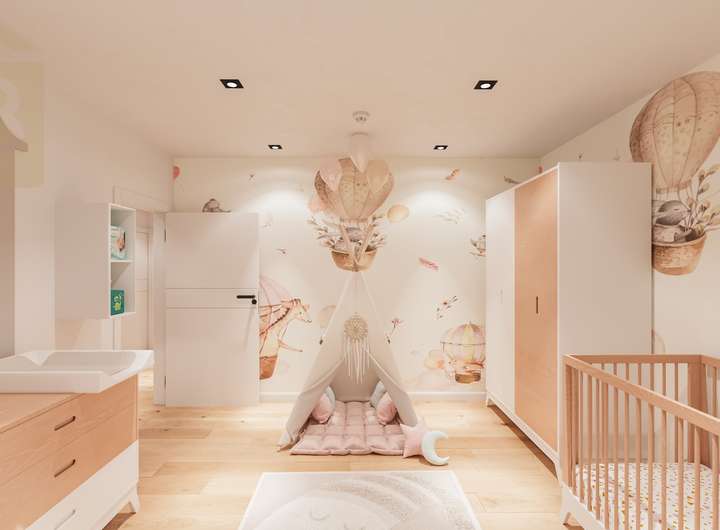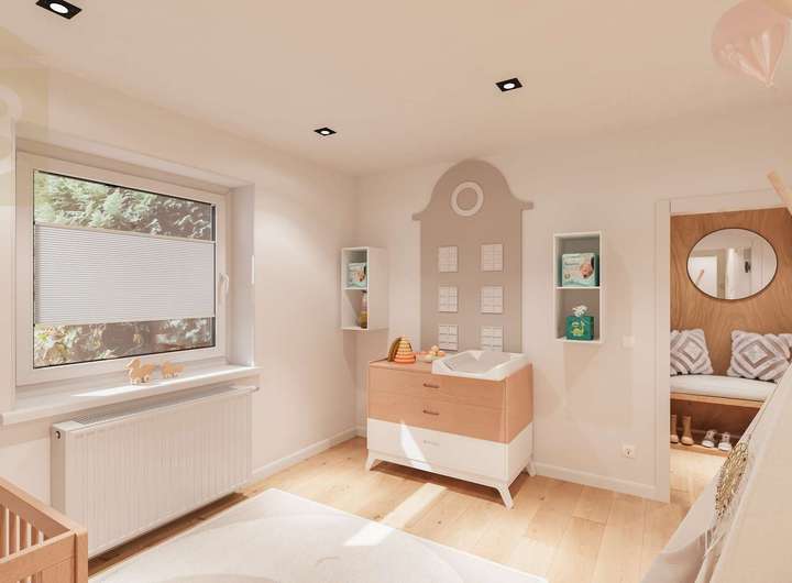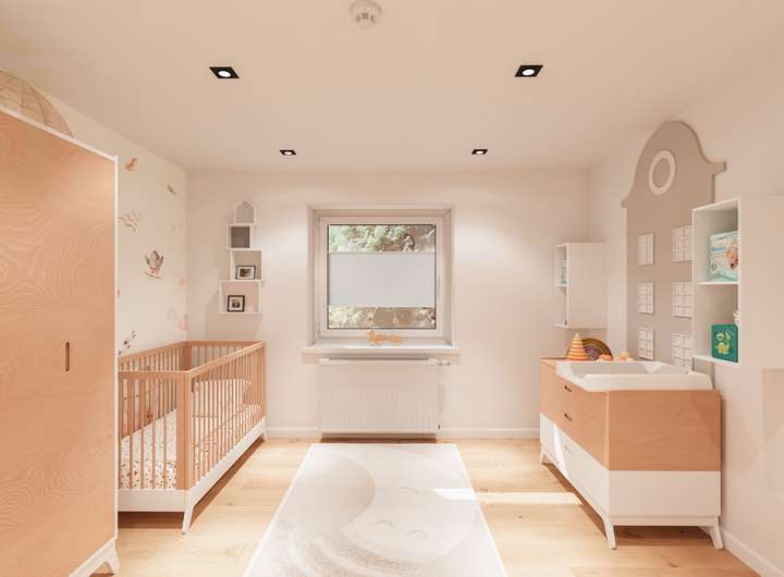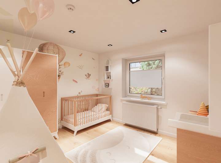 Im Erdgeschoss eröffnet sich ein gut geschnittener Grundriss mit einem großen Wohn- und Esszimmer als zentralem Mittelpunkt des Familienlebens. Darüber hinaus stehen ein Elternschlafzimmer sowie zwei Kinderzimmer zur Verfügung, die flexibel als Schlaf-, Arbeits- oder Spielräume genutzt werden können. Ein Gäste-WC ist vorhanden. Das vollwertige Badezimmer ist mit Dusche und Badewanne ausgestattet.