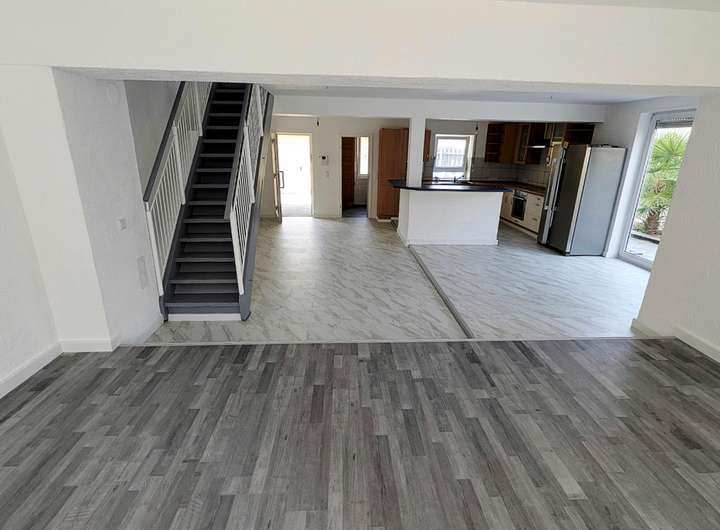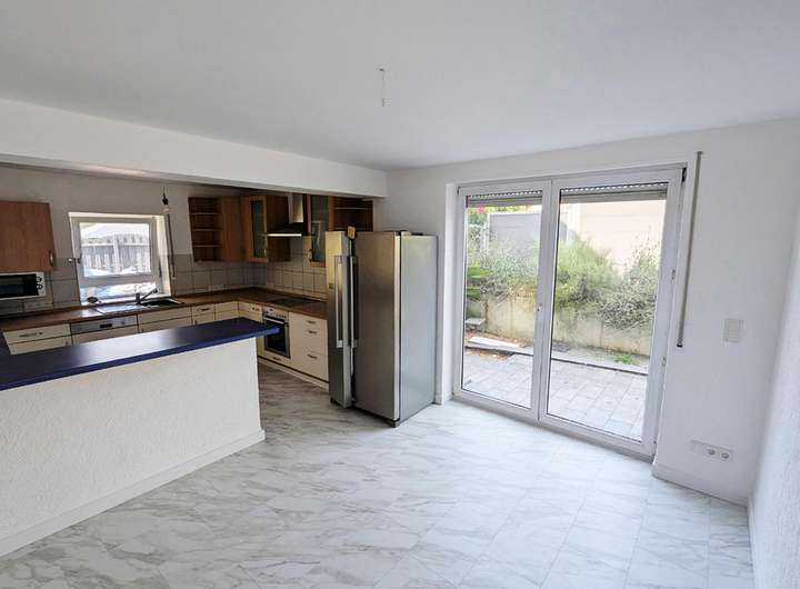Sie betreten die Doppelhaushälfte im Erdgeschoss durch eine kleine Diele. Das Erdgeschoss verfügt über eine Küche und einen großzügigen Wohn- und Essbereich. Aus dem Wohnzimmer treten Sie ebenerdig über die Terrasse in den Garten hinaus. Ein Gäste-WC und ein Abstellbereich in der Diele sind im Erdgeschoss zusätzlich vorhanden.