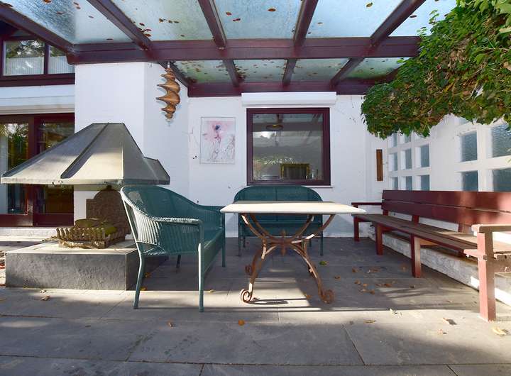 Große, erneuerte Terrassenflächen mit Außenkamin, zum Teil überdacht, und eine seitlich am Haus angeordnete "Wintergarten-Bar" unterstreichen den individuellen Charakter des Hauses.