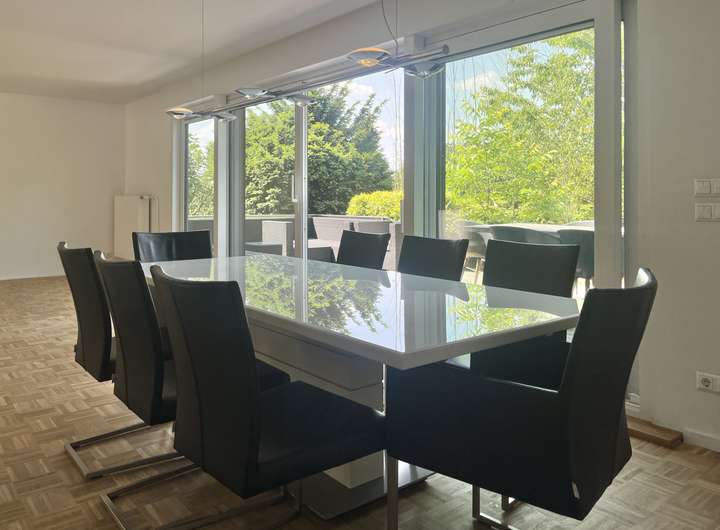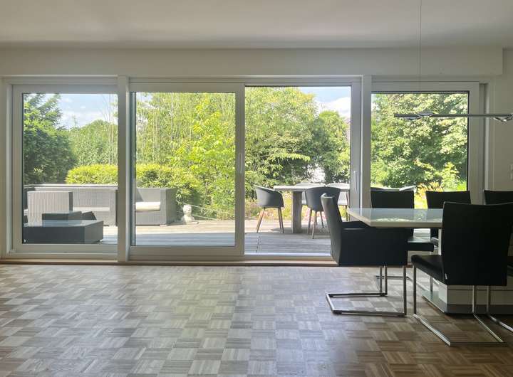 Der mit einer Glas-Schiebetür vom Flur trennbare riesige Wohn- und Essbereich wird durch bodentiefe Fenster mit viel natürlichem Licht versorgt. Von hier aus blickt man auf die großzügige Terrasse und den dahinterliegenden idyllischen, grünen Garten.