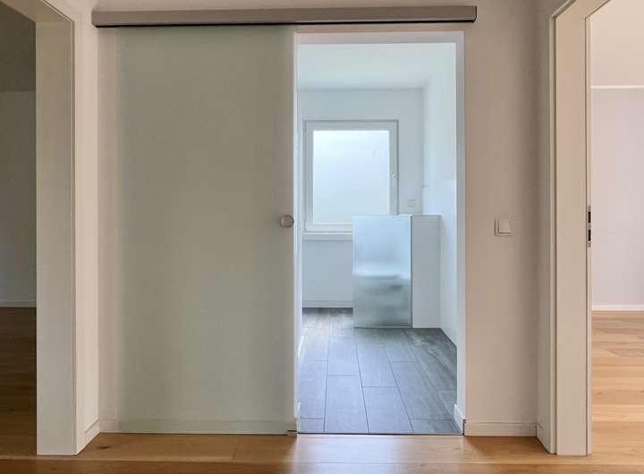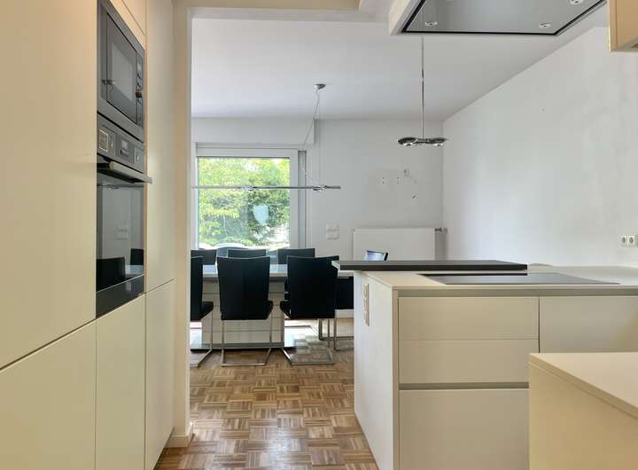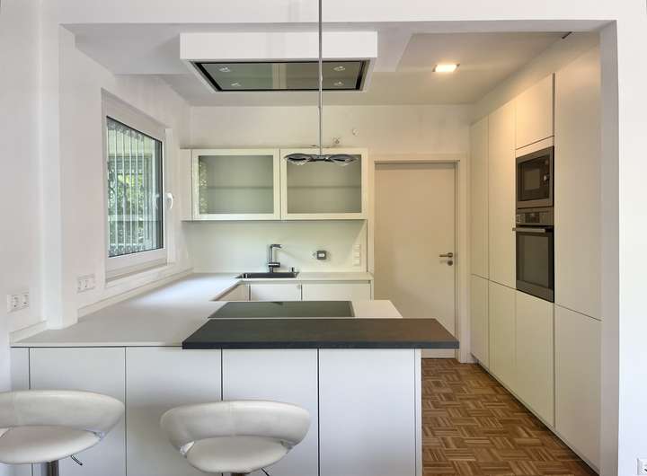 Die offene Küche schließt sich mit einer Sitztheke vor dem Kochbereich an den Essbereich an und ist mit einer hochwertigen Einbauküche inkl. E-Geräten ausgestattet. Sie bildet den kommunikativen Mittelpunkt des familiären Lebens.