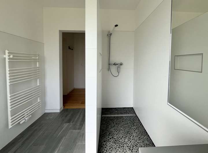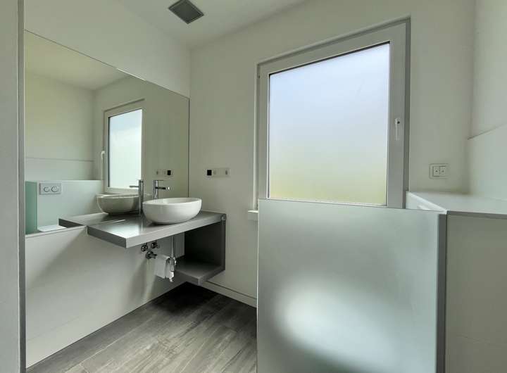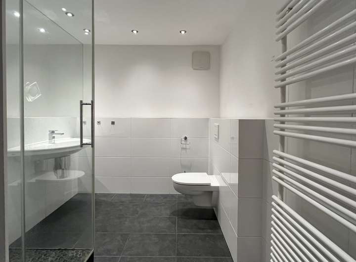 Zusätzliche Räume: ein Tageslicht-Bad mit Dusche, Tageslicht-Gäste-WC, ebenfalls mit modernem Anthrazit-Fliesenboden ausgestattet.