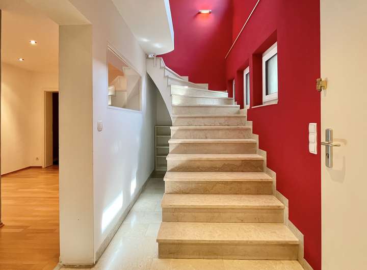 Da das Haus am Hang liegt, gelangen sie über eine elegante Marmortreppe in die obere Etage, die quasi zum Garten hin das Erdgeschoss darstellt. Über den großzügigen Flurbereich erreichen Sie alle weiteren Räume des Hauses: