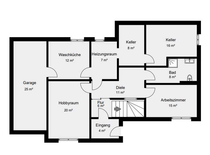 In der unteren Etage, wo sich auch der Hauseingang befindet, gibt es zwei Zimmer (nutzbar als Schlaf-, Arbeits-, Kinder- oder Ankleidezimmer), die Waschküche und den Zugang zur Garage, der Heizungsraum und zwei weitere Kellerräume.