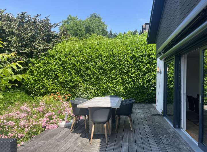 Hier wohnen Sie ohne direkte Beeinflussung von Nachbarn und können diese grüne Oase genießen. Die große Terrasse mit dem sich anschließenden Garten bildet quasi ein zusätzliches Zimmer für das Haus, da sie in der warmen Jahreszeit sicherlich viel Wohn- und Lebensqualität birgt.