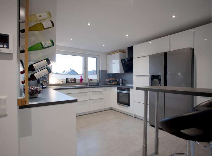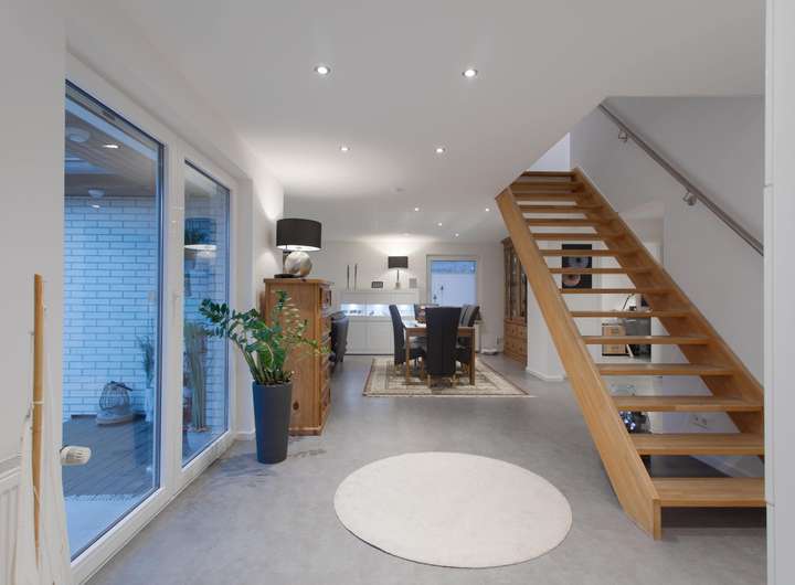 Die Hauptwohnung verfügt über eine Einbauküche, ein Gäste-WC sowie einen Balkon. Der Eingangsbereich ist mit pflegeleichten Fliesen versehen, und eine Massivholztreppe verbindet die Ebenen der Maisonette. Decken-Spots sorgen in ausgewählten Bereichen für zeitgemäße Beleuchtung.