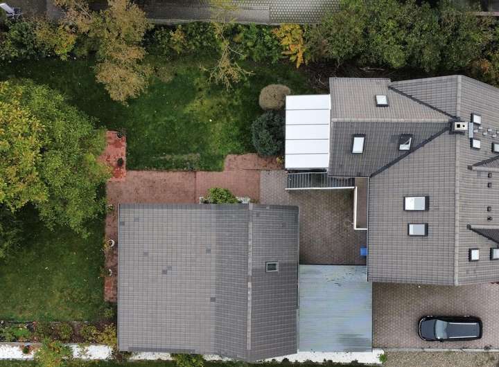 Das Außenangebot ist ein echtes Plus: zwei Garagen, ein Carport und zusätzliche Stellflächen bieten ausreichend Platz für mehrere Fahrzeuge. Beide Wohneinheiten haben direkten Zugang zum Garten.