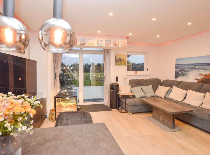 - offenes Wohn- und Esszimmer, Zugang zu Terrasse und Garten