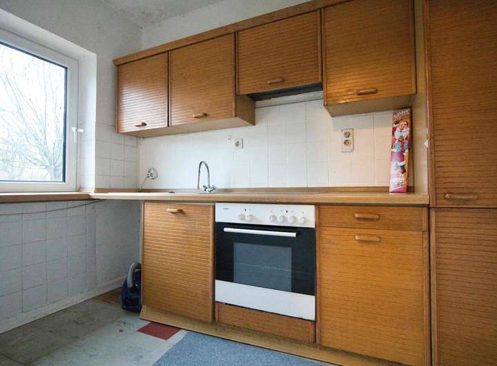 Die praktische Wohnküche im EG auf ca. 7m² bietet Platz für eine Einbauküchenzeile mit diversen Ober-/ und Unterbauschränken, Cerankochfeld und Backofen, Abzugshaube, eine Kühl-/ Gefrierkombination und eine Spüle. Die Einbau-Küche ist etwa 25 Jahre alt. Im Falle eines gestützten Durchbruches ist hier auch die Schaffung einer offenen Wohnküche möglich. Diese Grundrissumgestaltung böte ein neue Raumfläche von ca.29m².