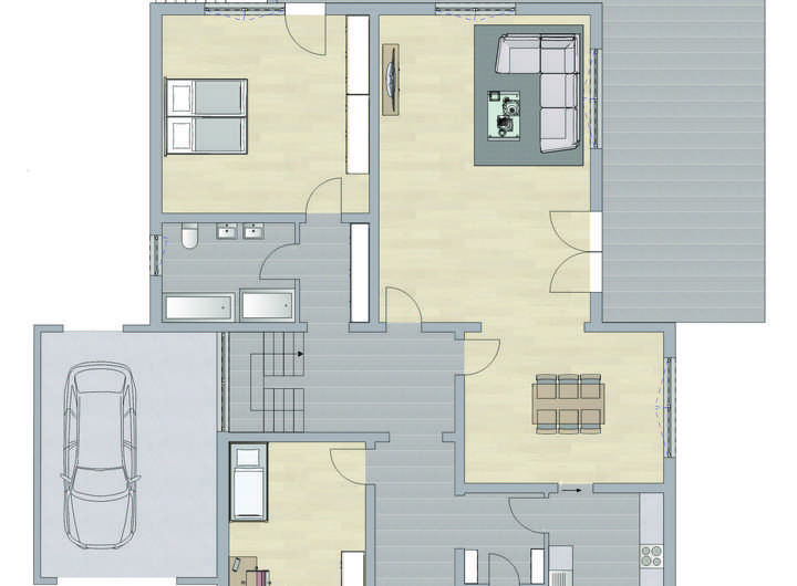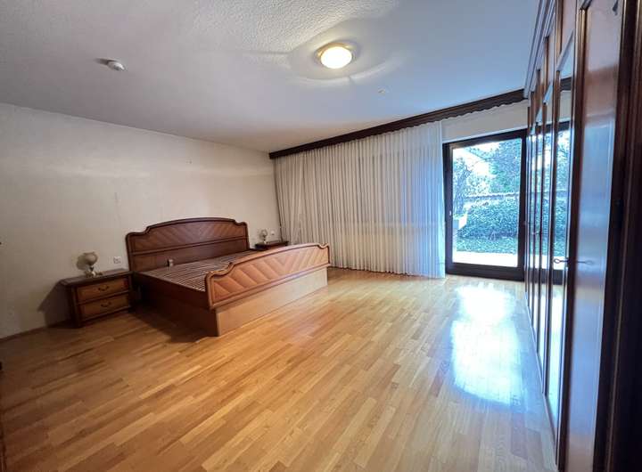 Weiterhin verfügt das Erdgeschoss über ein modernes Badezimmer sowie ein geräumiges Schlafzimmer – ebenfalls mit Zugang zum Garten und herrlichem Blick ins Grün.