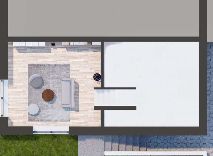 Ein hochwertiger Hauseingang führt Sie ins Herz des Hauses. Der großzügige Eingangsflur mit modernen Fliesen (auf Wunsch auch als offene Variante direkt ins Wohnzimmer) bietet links eine praktische Garderobe und eröffnet dann den Blick in das ca. 32 m² große, helle Wohnzimmer. Vom Wohnzimmer aus haben Sie direkten Zugang auf die ca. 9 m² große Gartenterrasse und in den privaten Garten.