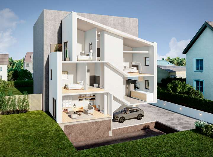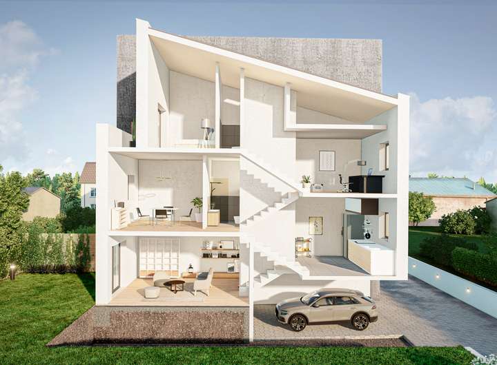 Das Haus ist in innovativer Split-Level-Bauweise errichtet, die für klare, funktionale Ebenen und für eine großzügige Wohnraumaufteilung sorgt. Bei einer kombinierten Wohn- und Nutzfläche von ca. 145,6 m² erstreckt sich Ihr Lebensraum zudem in den Außenbereich: ein lichtdurchfluteter Garten (mit ca. 241 m²), eine ebenerdige Gartenterrasse, zwei Balkone und eine exklusive Dachterrasse mit weitem Blick über Felder und Nachbarschaft.