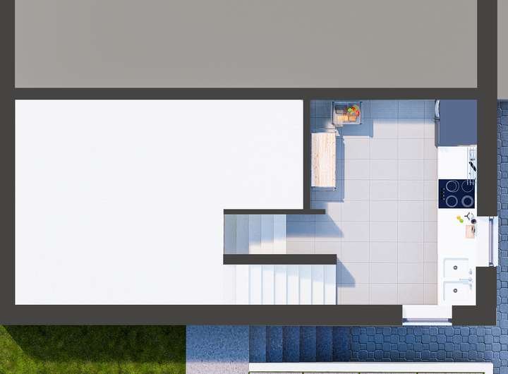 Die Stärke der Split-Level-Architektur zeigt sich in den intelligent versetzten Ebenen: Sie schaffen spannende Raumwirkungen, vielfältige Ausblicke und eine natürliche Trennung der Wohnbereiche. Die großzügige, knapp 20 m² große Küche – nach Wunsch offen gestaltet – lädt zum Kochen und Genießen ein.