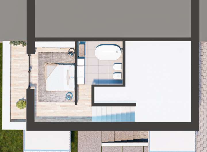 Das Highlight: Das gesamte Dachgeschoss als Elternbereich. Hier finden Sie Ihr über 14 m² großes Schlafzimmer, ein anschließendes, modernes Bad/Umkleidebereich (ca. 10 m²) und Ihre private, über 8 m² große Dachterrasse – der perfekte Ort, um nach einem langen Tag den Ausblick zu genießen. Ein ca. 17 m² großer Lagerraum im Dachboden bietet zudem reichlich Stauraum.