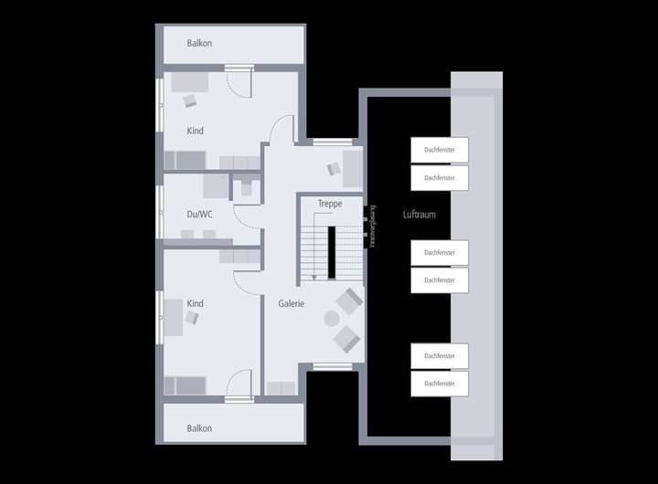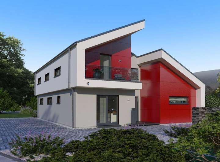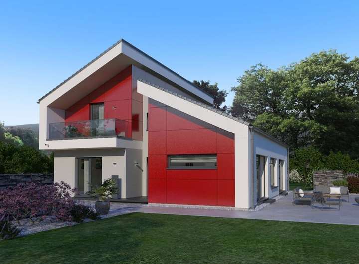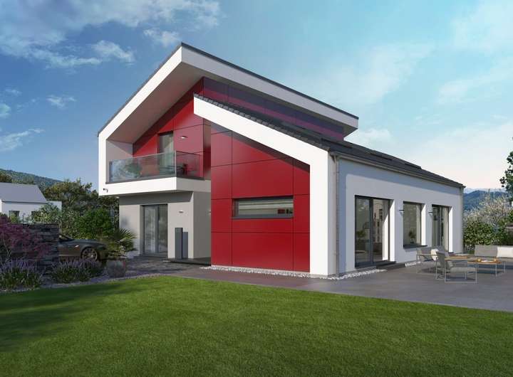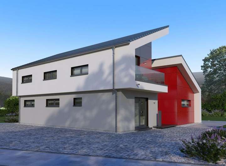 Bei unserem Musterhaus Simmern trifft eine außergewöhnliche Fassadengestaltung auf ein Wohnerlebnis der besonderen Art. Die Außengestaltung wird geprägt durch das versetzte Pultdach und den Rückversatz eines Bauteils, der durch zwei überdachte Balkone nicht nur optische, sondern auch echte wohnliche Mehrwerte mit sich bringt. Diese Mehrwerte setzen sich auch im Inneren fort. Attraktiver Mittelpunkt ist der mehr als 55 m² große Wohn-Ess-Koch-Bereich, der mit zahlreichen Fensterelementen und mit den hohen Decken punktet und dadurch noch größer wirkt. Auch der Rückzugsort der Eltern befindet sich Parterre: mit Schlafbereich, Ankleidezimmer, Badezimmer und separater Toilette. Büro und Gäste-WC runden das Raumangebot im Erdgeschoss ab. Oben: das Reich der Kinder. Highlights hier sind die beiden Balkone und die große Galerie. Musterhaus Simmern - mehr als Wohnen.