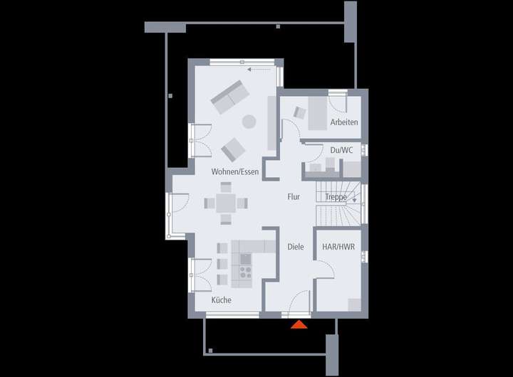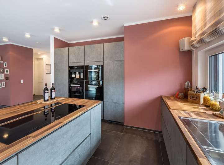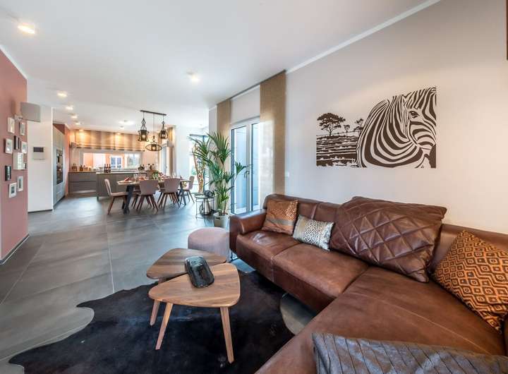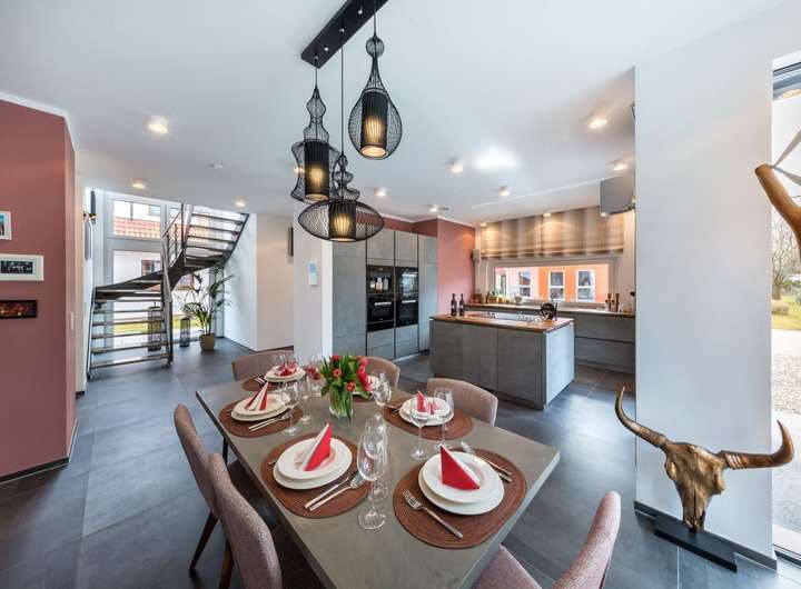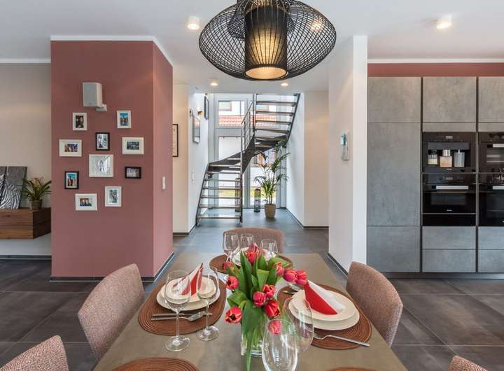 Für alle Naturliebhaber: Zwei Balkone sowie die große und teilweise überdachte Eckterrasse ermöglichen ganzjährig den Weg nach draußen. Die stützenden Wandscheiben setzen architektonische Akzente und bieten Wind- und Wetterschutz. Und auch für den Innenbereich gilt: typisch OKAL!