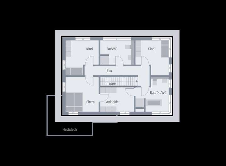 Im Obergeschoss eignen sich zwei identisch große Räume mit eigenem Duschbad für den Nachwuchs, während die Eltern ihren persönlichen Bereich auf über 38 m² ungestört genießen können.