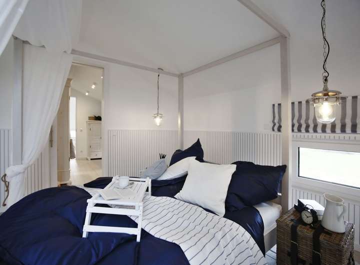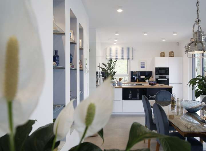 Unter dem Satteldachhaus mit maritimem Flair stecken 194 m2, die viel Raum zur Entfaltung gewähren. Der 16 m² große Eck-Anbau eignet sich z. B. für ein Home-Office, welches bei Bedarf noch um ein weiteres, an die Diele angrenzendes, Zimmer ergänzt werden kann. Weiterhin im Erdgeschoss: die offene Küche, der Essbereich und das nur durch eine Teilwand abgetrennte Wohnzimmer, mit herrlichem Blick nach draußen. Großzügigkeit und Offenheit prägen hier die Atmosphäre.
