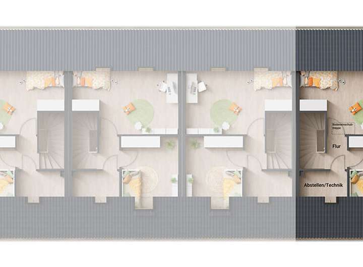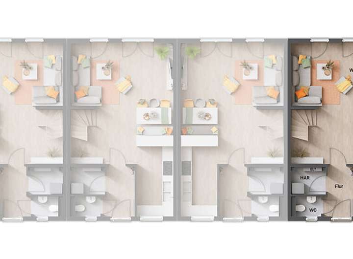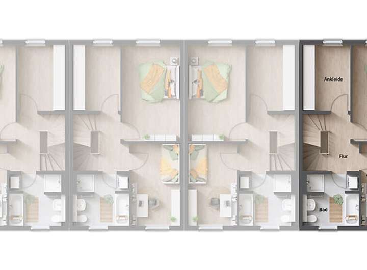 Das Reihenhaus Mainz 128 bietet Ihnen die ideale Kombination aus modernem Wohnen und effizienter Flächennutzung. Mit vier Wohneinheiten entsteht ein attraktives Zuhause, das zugleich Raum für Individualität und Gemeinschaft schafft. Jede Einheit verfügt über rund 140 Quadratmeter Wohnfläche, verteilt auf drei Etagen mit einem großzügigen Wohn- und Essbereich im Erdgeschoss, komfortablen Schlaf- und Kinderzimmern im Obergeschoss sowie einem vielseitig nutzbaren Studio im Dachgeschoss.
