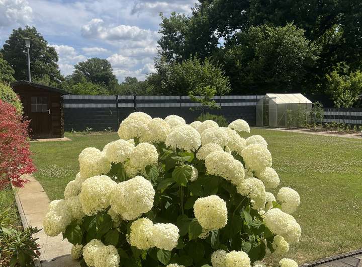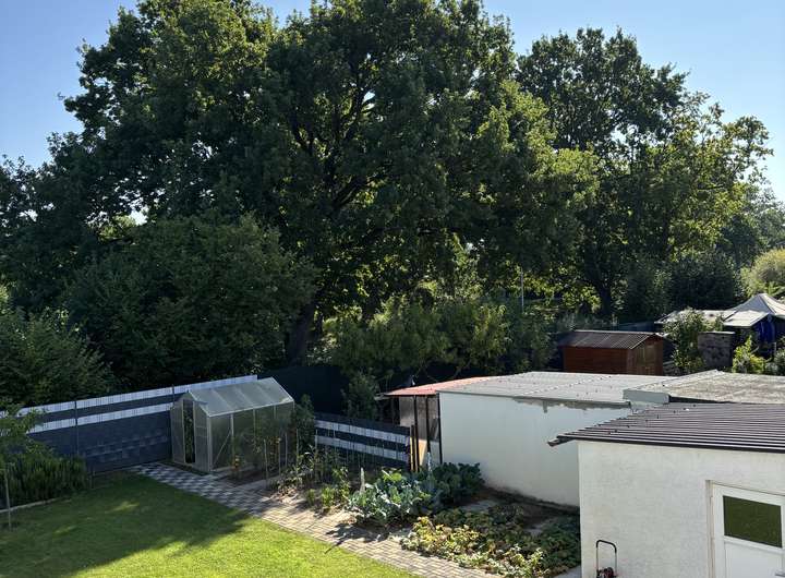 Der Garten ist liebevoll gepflegt und bietet eine großzügige Rasenfläche, ein separates Gemüsebeet mit Gewächshaus, eine Gartenhütte sowie einen geschützten Sitzbereich für entspannte Stunden im Freien.
