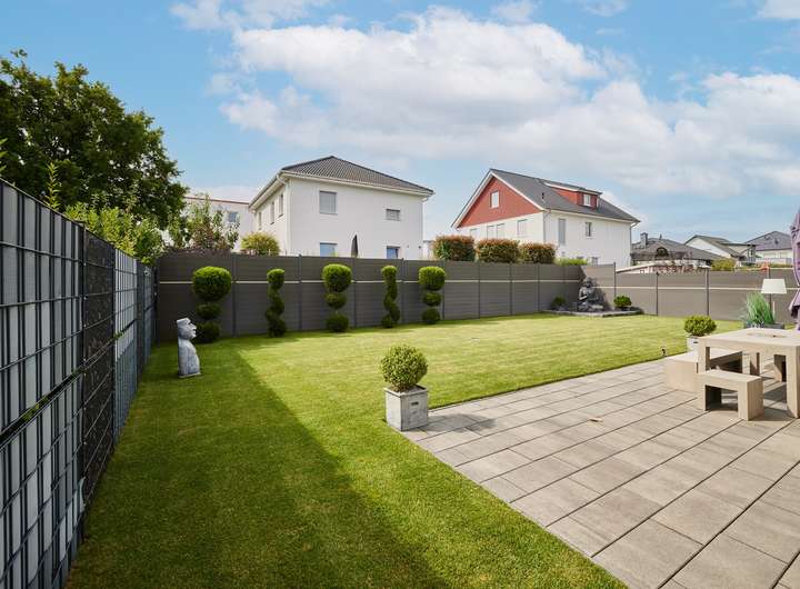 Sonnige Terrasse (70 m²) mit Hochbeet seitlich
