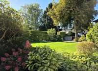 Die mit viel gepflegtem Grün & frischem Rollrasen ausgelegte Außenanlage beinhaltet ein massives Holzhaus & eine beheizte Doppelgarage sowie einen zusätzlichen Stellplatz.