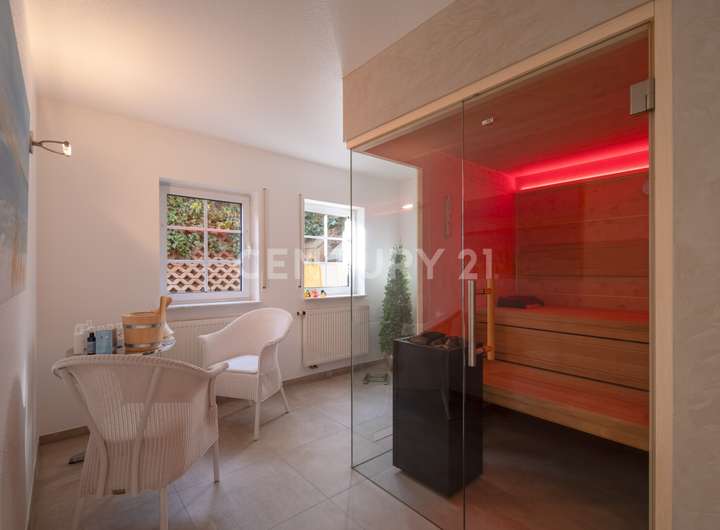 Der Wohnkomfort setzt sich im Untergeschoss fort. Hier befindet sich eine vollwertige Einliegerwohnung mit separatem Wohnraum, Küche und Badezimmer – ideal für erwachsene Kinder, Gäste, ein Au-pair oder als hochwertiges Homeoffice mit absoluter Ruhe. Auch eine Vermietung ist problemlos realisierbar und steigert die Flexibilität sowie den wirtschaftlichen Wert der Immobilie. Ein moderner Saunabereich ergänzt das Untergeschoss und bietet einen exklusiven Rückzugsort für Entspannung und Regeneration.