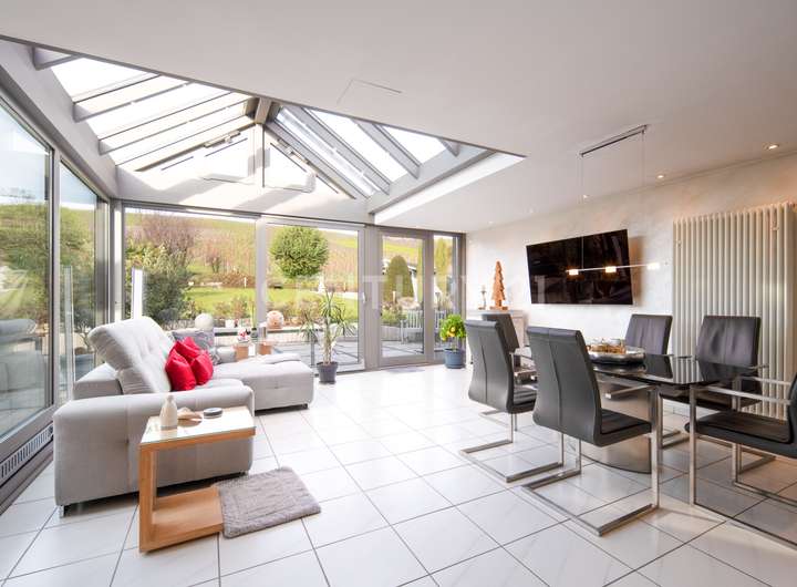 + großzügiger, moderner Wintergarten mit Glasdach mit 3-fach-Verglasung und integrierter Sonnenschutzanlage aus 2018