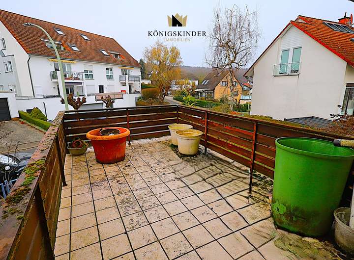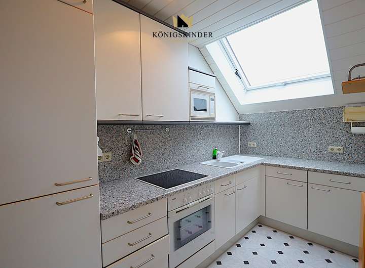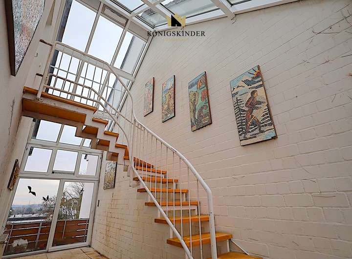 Und jetzt kommen wir zu einer außergewöhnlichen Gestaltung: durch einen über zwei Etagen reichenden Wintergarten erreichen Sie die Dachterrasse auf der Garage und über eine elegant geschwungene, offene Treppe das ausgebaute Dachgeschoss mit zwei Zimmern, einem sehr komfortablen Bad und einer eingerichteten Küche. Vor dem Wintergarten nach Süden gelegen befindet sich ein Balkon mit freiem Blick auf die Mainebene.