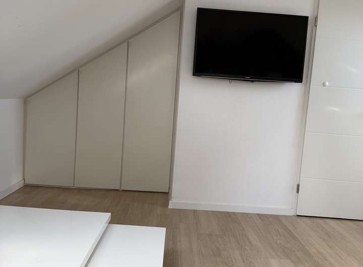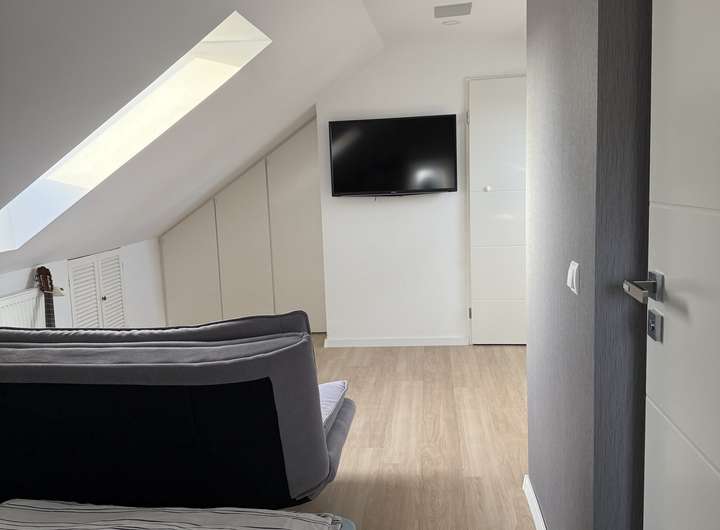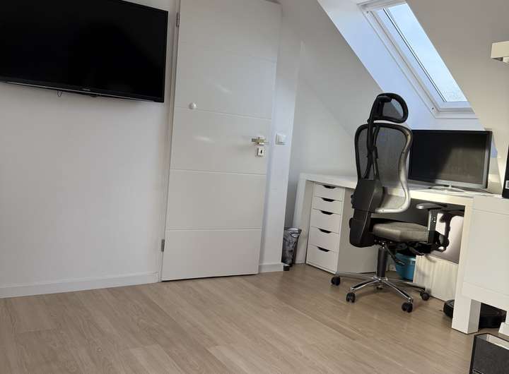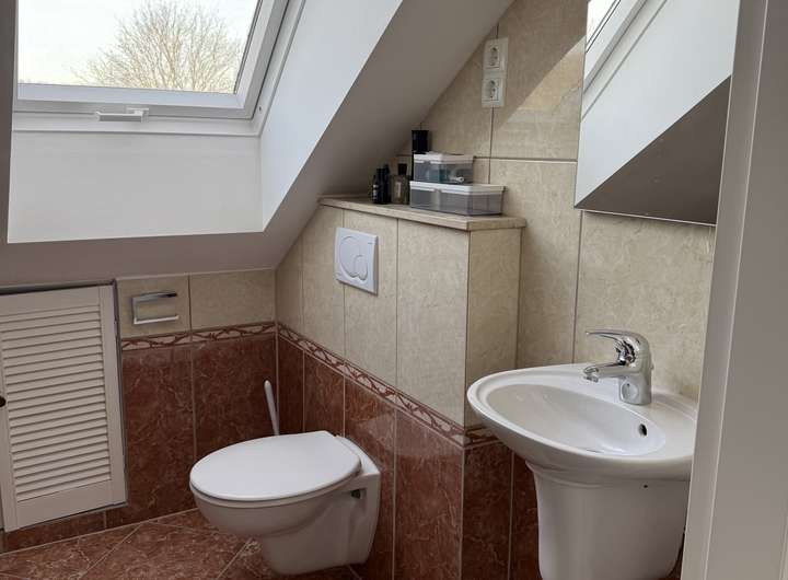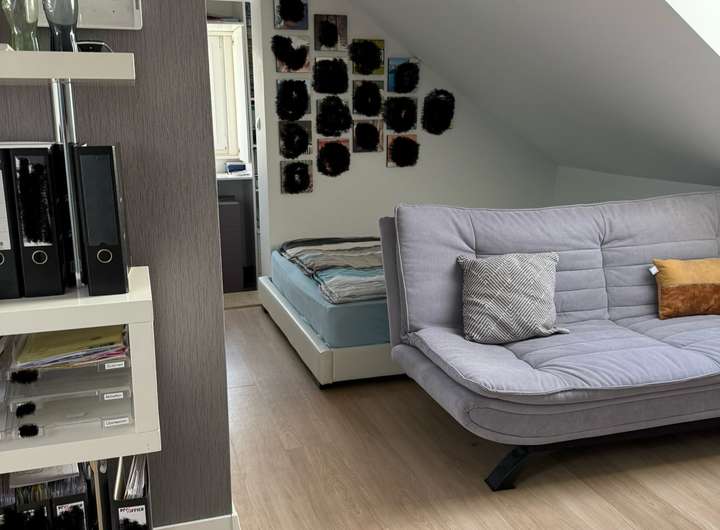 Das ausgebaute Dachstudio bietet ein weiteres großzügiges Zimmer/Studio mit eigenem Bad und Badewanne.