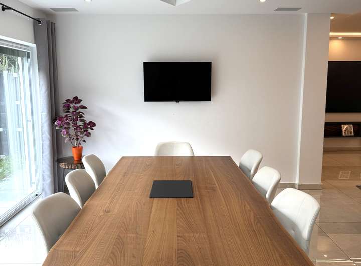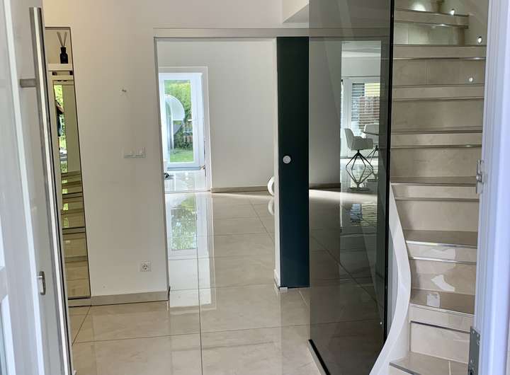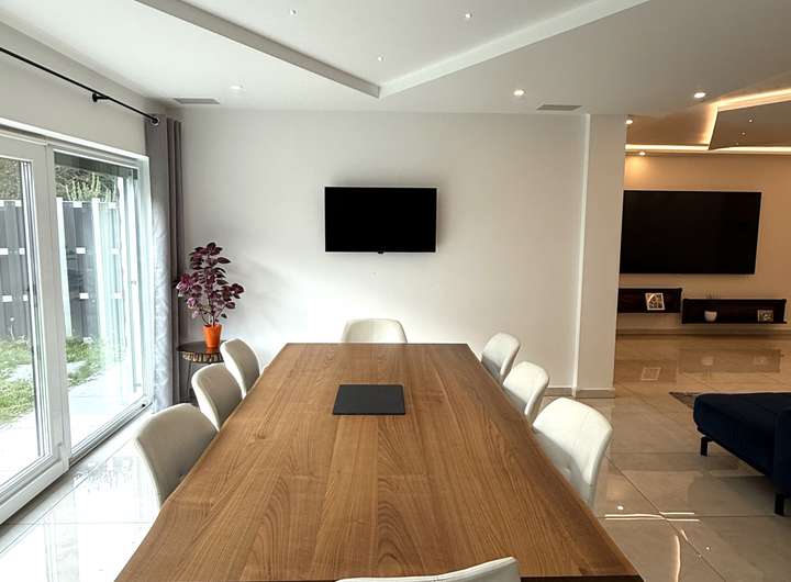 Das Haus verfügt über 6 Zimmer, einen Fitnessraum mit Gästecouch, zwei Tageslichtbäder sowie ein Gäste-WC – in ruhiger, kinderfreundlicher Lage mit Kindergärten und Schulen in direkter Nähe. Seit dem Baujahr 1959 wurde die Immobilie fortlaufend erweitert (2003 und 2007) und 2017/2018 umfassend modernisiert. Technisch wurde das Haus auf höchstem Niveau ausgestattet: voll integriertes Smart-Home-System, Sonance-Musikanlage in jedem Raum, unsichtbares Heimkino im Wohnzimmer sowie App-steuerbare Beleuchtung, Rollläden und Sicherheitssystem.