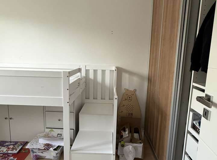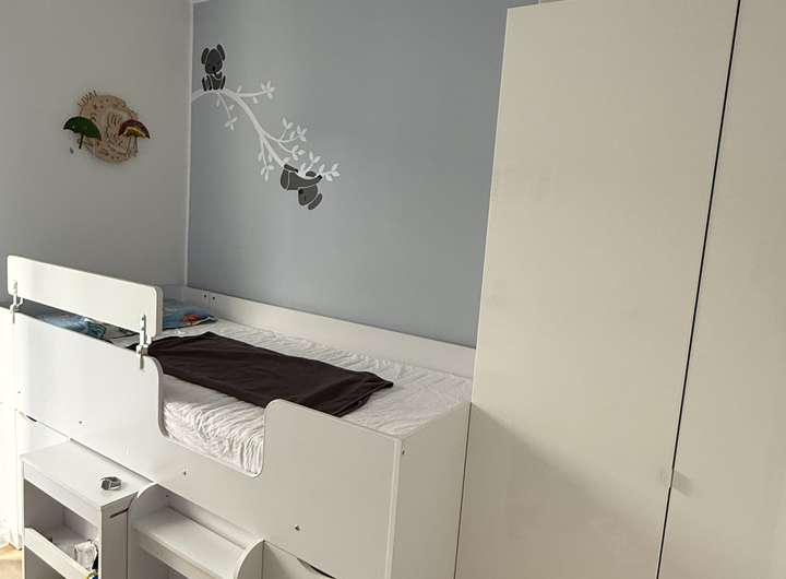 Im Obergeschoss befinden sich zwei Kinderzimmer, ein modernes Tageslichtbad mit Regendusche und drei seitlichen Massagedüsen sowie ein Elternschlafzimmer mit großem Familienbett für zwei Erwachsene und zwei Kinder inklusive begehbarer Ankleide.