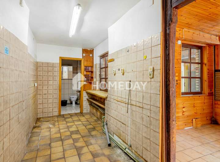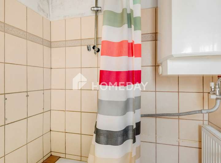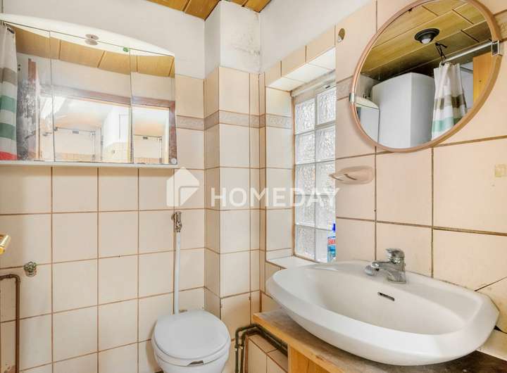 Im Inneren zeigt sich die Immobilie in einer schlichten, gepflegten Ausstattung. Das großzügige Tageslichtbad mit Dusche bietet dabei angenehmen Komfort. Küche und Bad stammen aus dem Anbau der 1940er-Jahre und ergänzen das historische Haupthaus funktional. Die Wohnräume sind mit Laminat und Fliesen gestaltet, während wärmedämmende Holzfenster mit Zweifachverglasung für ein angenehmes Raumklima sorgen.